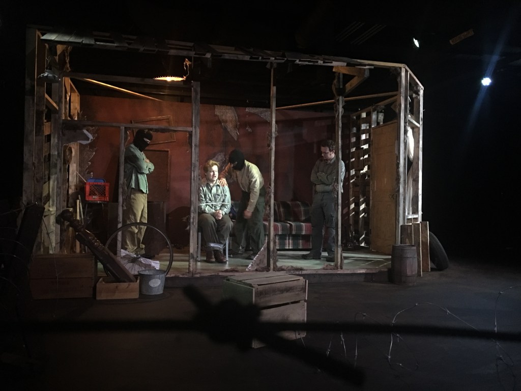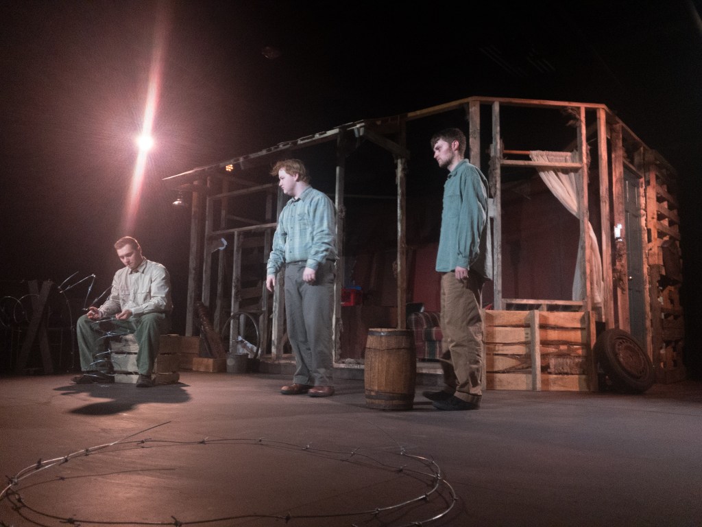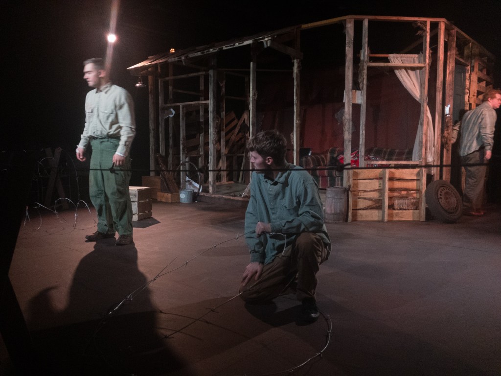 “impressive was the spectacle–particularly its attention to detail. Designer Soren Olsen produced a convincing and ominous set: a rugged shack with crumbling walls and a barbed wire fence. Adding to the realism, the scenery immediately caught the audience’s attention and maintained it.”