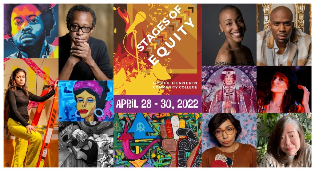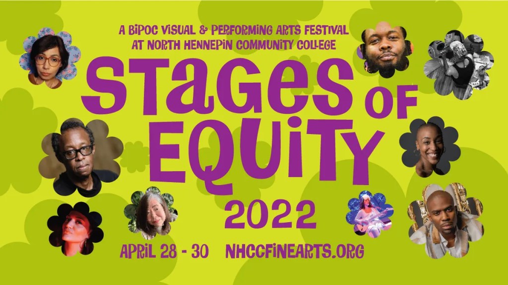 As its name announces, the Stages of Equity Festival at NHCC seeks to create a long overdue paradigm shift in the visual and performing arts that redresses systemic racial inequities that continue to proliferate in all fields of the arts. In the arts, these inequities are two-fold: they describe both the under-representation of artists of color’s voices and a lack of access to the arts for BIPOC audiences. North Hennepin’s festival creates an intervention that acknowledges a history of racialized inequity and strives to rectify under-representation by creating a platform that centers the powerful artmaking of people of color, and thus, the stories of their lived experiences. Stages of Equity believes foregrounding artists of color provides a mechanism not only for redress but also for social uplift that NHCC hopes nurtures a sense of belonging and inclusion for artists of color, our diverse students, and our diverse community of Brooklyn Park.